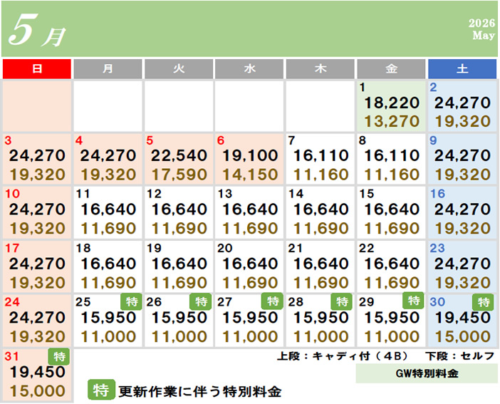 | 土日祝 | 6,600円 | 1組 9,900円 |